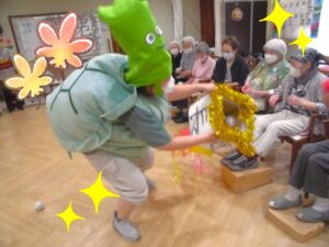「もしもし亀よ~」の歌いながら動きまわる籠に狙いを定めて紅白のボールを投げ入れていらっしゃいました✨