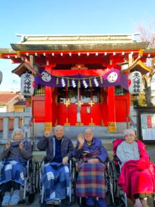 外出が難しいご利用者様のために、手作り神社を苑内に設置いたしました。皆様、真剣にお祈りをされていました。お参りの後は神社をバックに写真撮影を行い、皆様から笑顔が見られました。