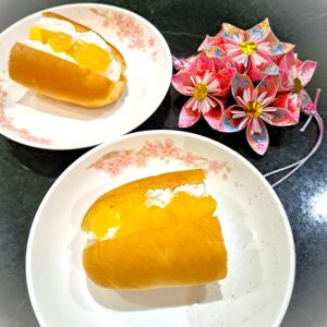 フルーツ、栗、紅白2色のクリームをたっぷり挟み、新年らしい華やかなおやつになりました。