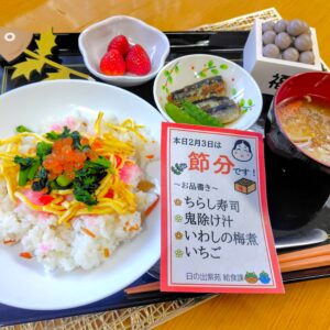 ・節分ちらし・鬼除け汁・いわしの梅煮・いちご をご用意しました。