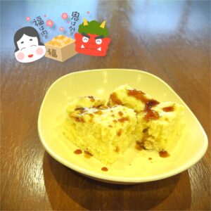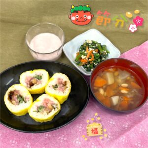 この日は行事食として節分にちなんだ巻き寿司、おやつは大豆ときなこを使った蒸しパンを召し上がって頂きました。
