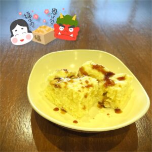 厄を払う「福豆」として親しまれる大豆、きな粉をたっぷり生地に混ぜてふんわり焼き上げ、黒蜜で和風に仕上げました。