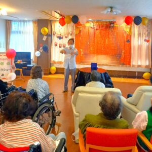 秋には敬老会でマジックショーを開催。当事業所の訪問介護を利用されていた方のご縁で、ボランティアとしてマジックを披露して頂いております。